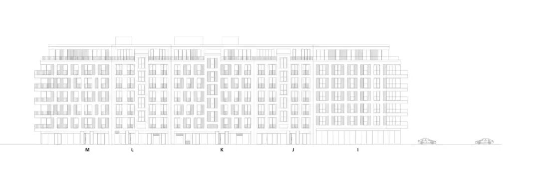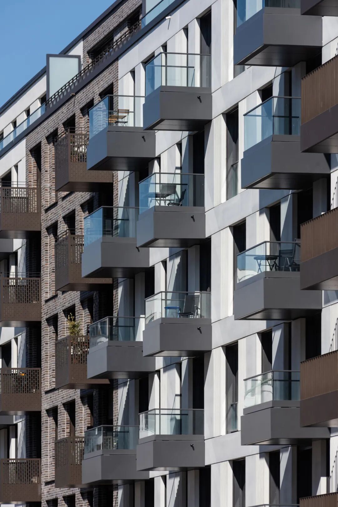 窗扇和盲窗区域通过凹槽、波纹或颜色强调和放松。不同的阳台设计强化了生动的立面形象。玻璃栏杆用于匹配混凝土表面,为砖石立面提供单独的金属栏杆。这里将共建182套公寓,共享地下停车场有86个停车位。一房至两房的公寓面积从46平方米到146平方米不等。在北面和东面,底层公寓将有梯田区,带有灌木和树木的小前花园和游乐区。该项目是 KfW Efficiency House 55。