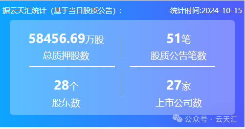 2024年10月15日,股票质押总质押股数5.85亿股,上市公司数27家,股质公告笔数51笔,股东数28个。