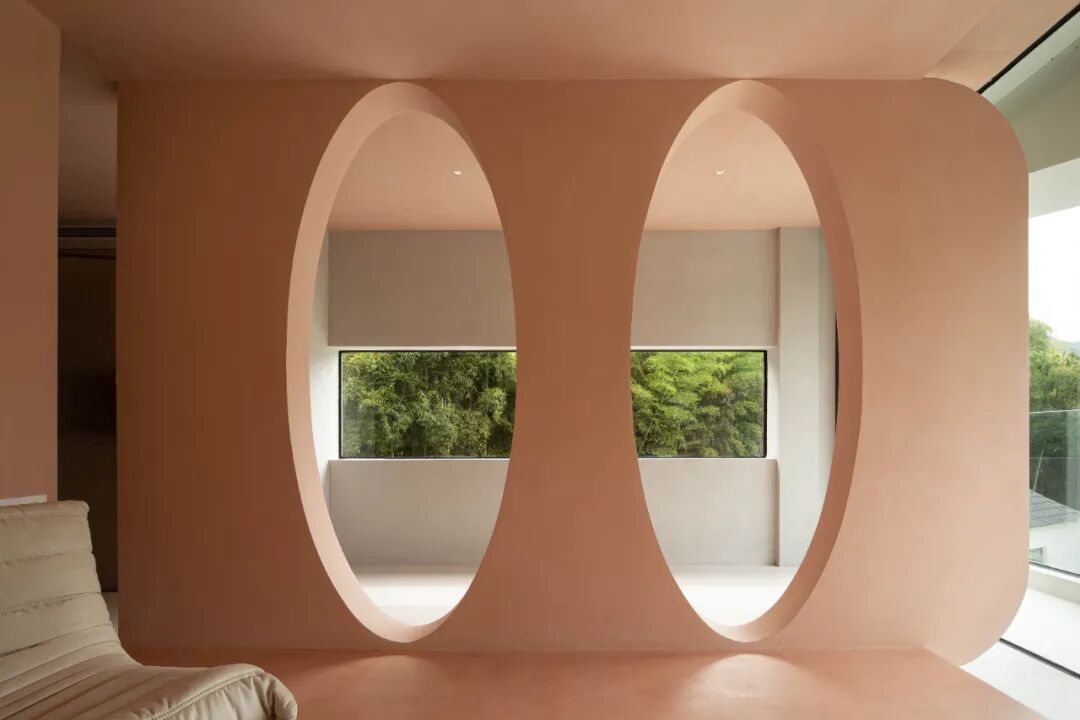 Designers will be building design technique applied to indoor unity, maintain the order and logic of its design, achieve the unity of the indoor and outdoor, with the extension of water system and the building block, build a nature "shuihedandan,shandaosongzhi ",round hole break depressing feeling of the block triangular form, pet became the protagonist here, the can clock in photographs.