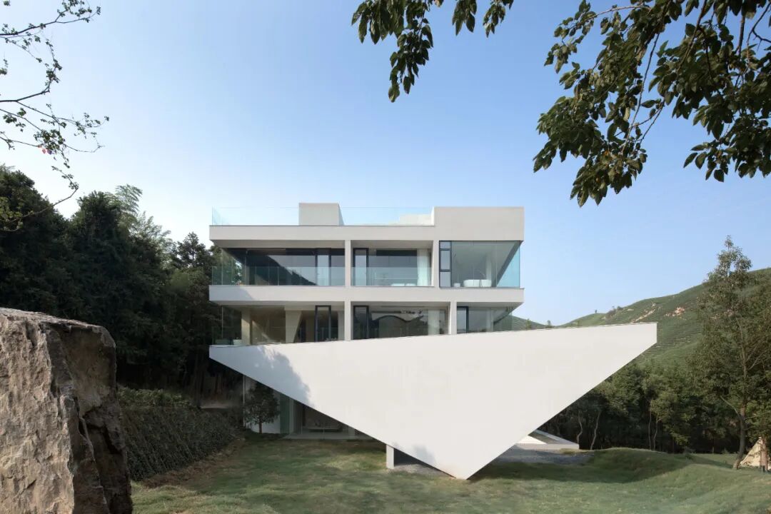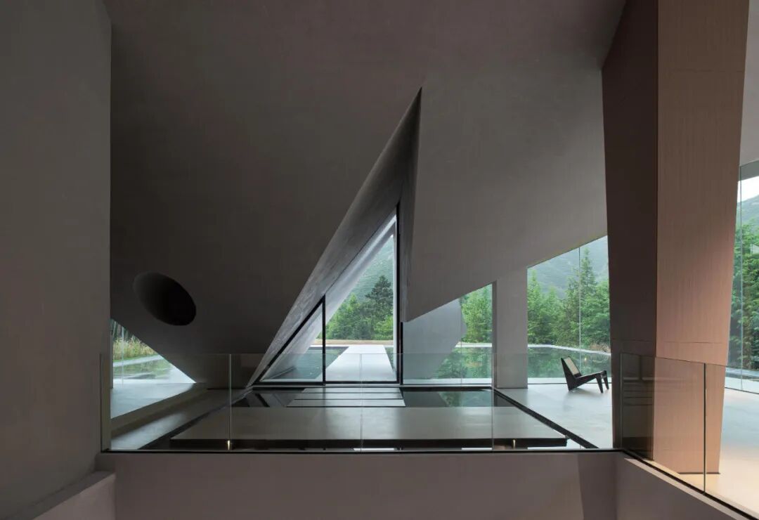 从建筑结构延伸出的三角形体块犹如动物的尾巴,建筑瞬间活了起来,与周边山野产生互动。