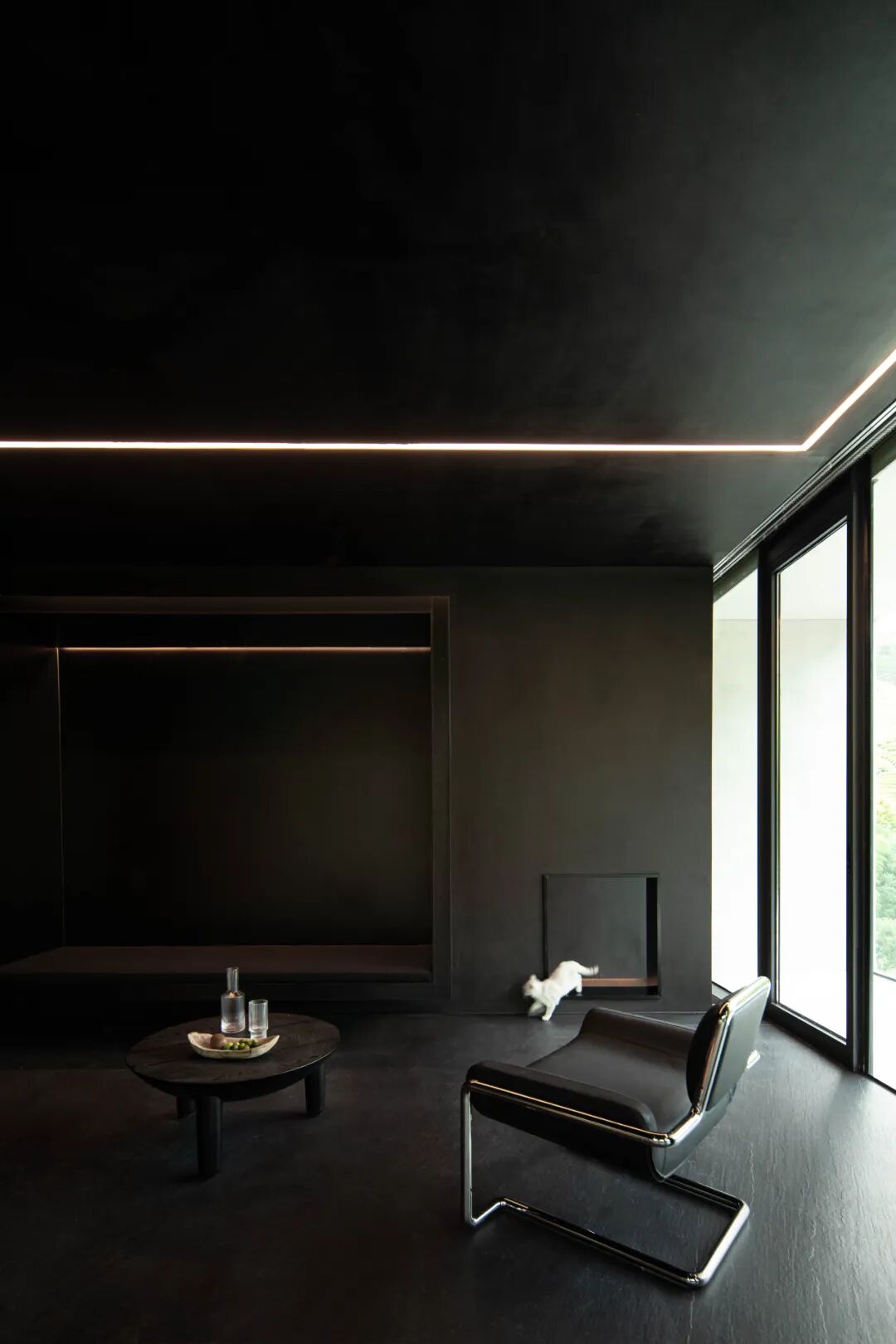 根据鼠生活环境,选用黑色为主视觉元素,搭配线性灯带,让房间呈现出神秘又温暖的质感。墙面上开出的洞口模拟老鼠出入的轨迹,宠物与小孩可以自由在这里自由进出。
