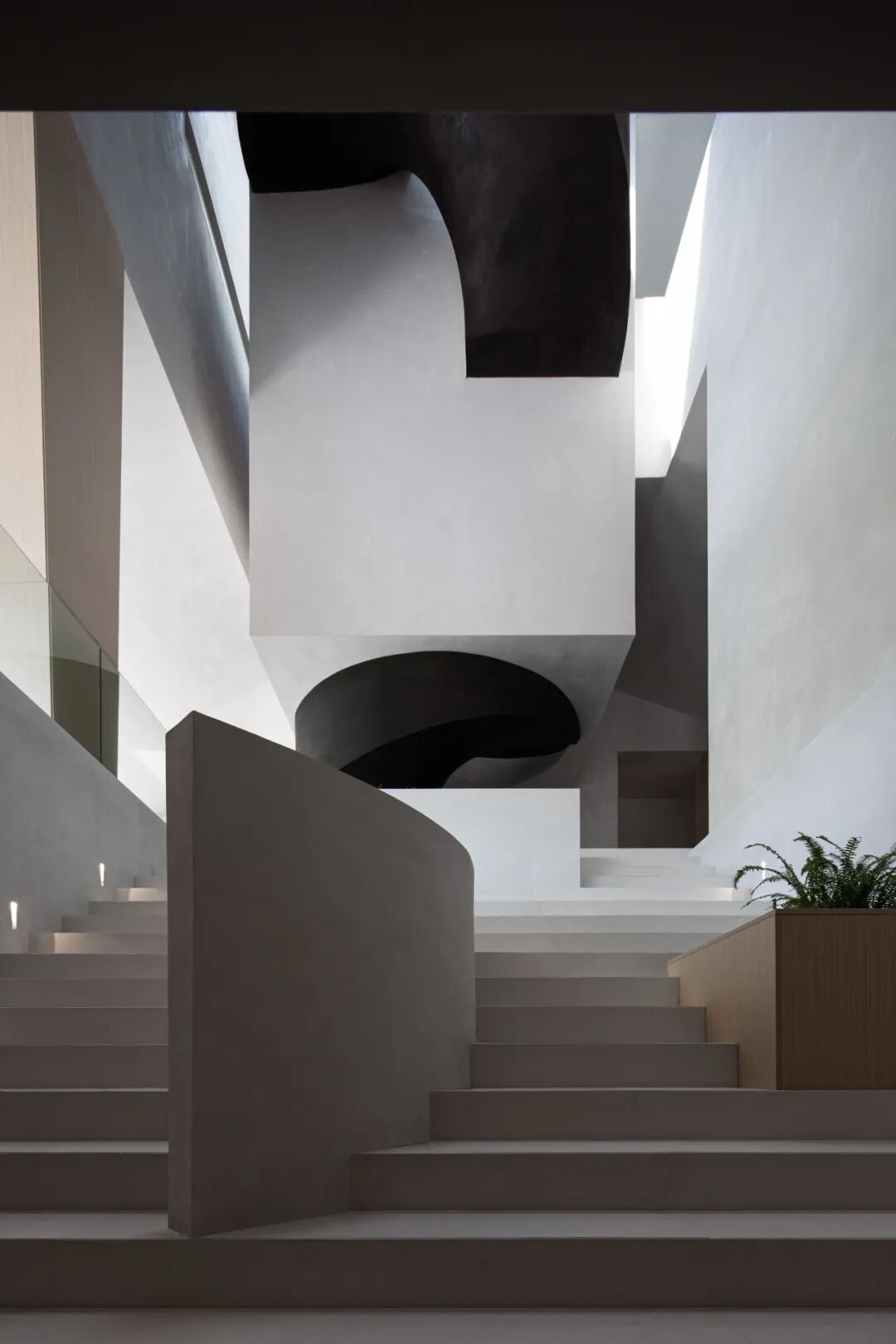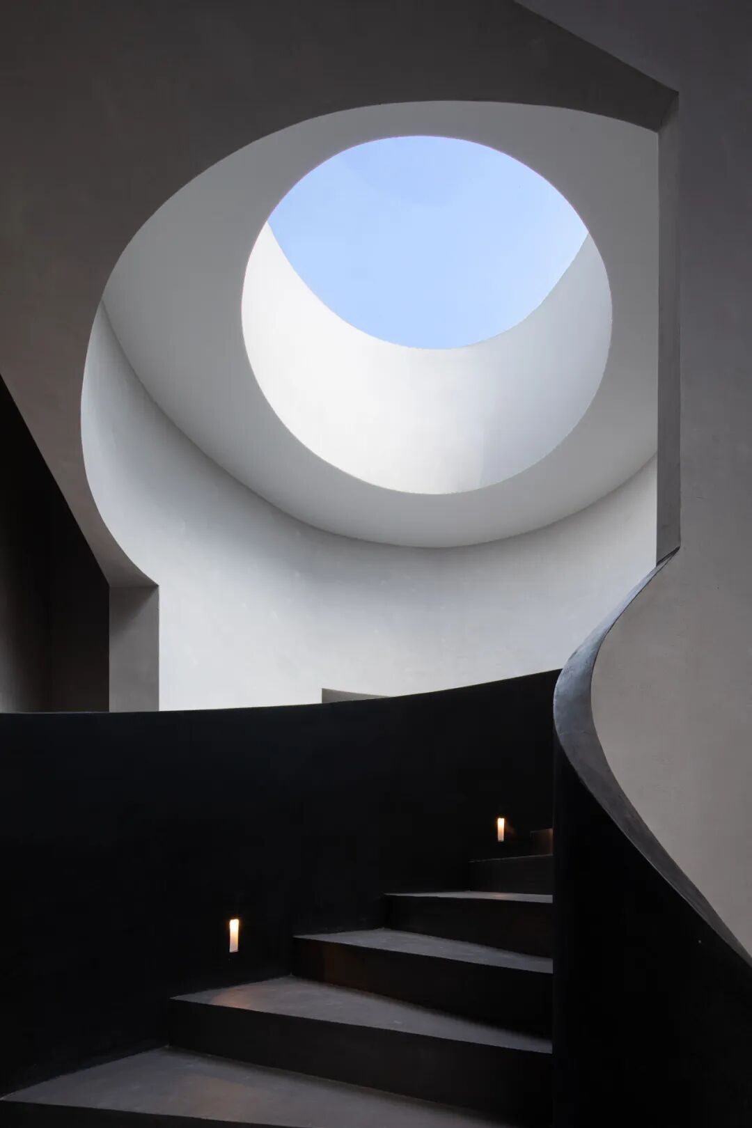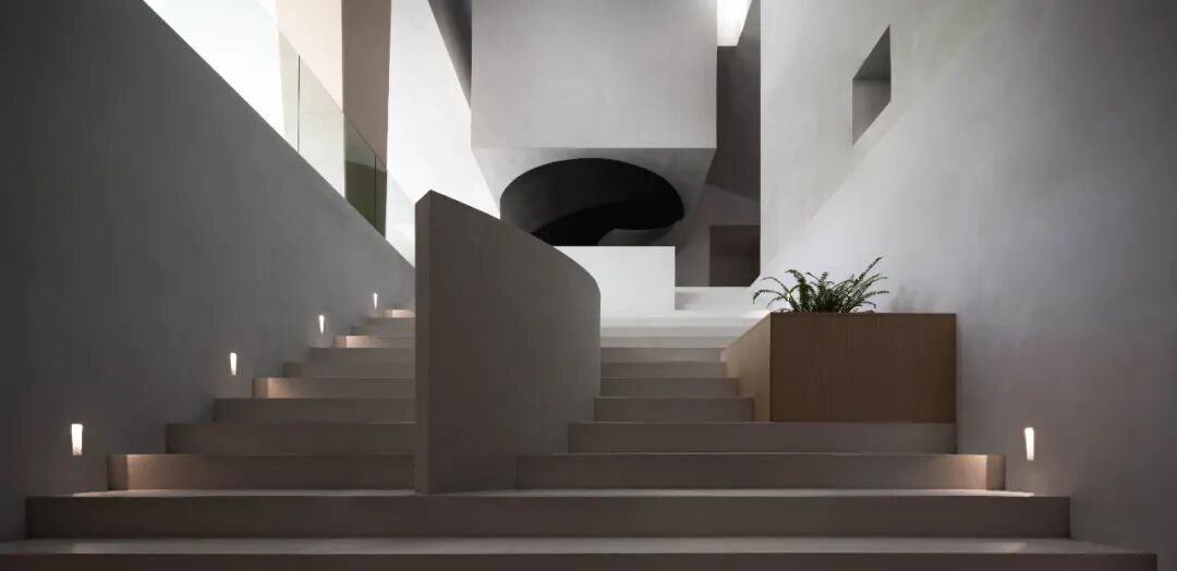 挑空式楼梯如一个巨大的雕塑装置,为空间增添了艺术气息。通过体块的穿插,像是一条盘旋的飞龙,顶部开窗让龙自由地来去,穿梭在整个建筑中。空间瞬间灵动万分,传递出对万物有灵的敬畏感。
