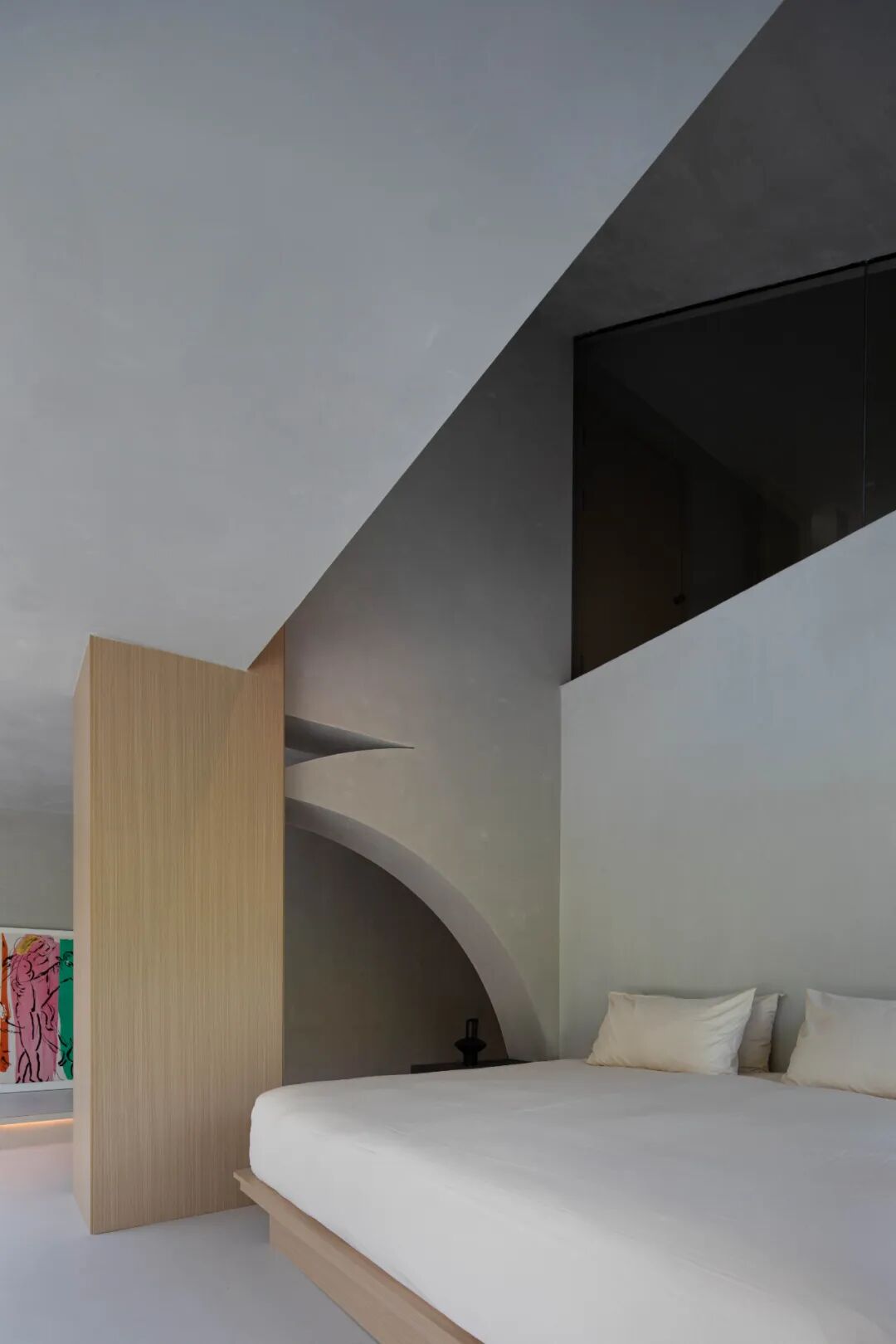 几何形体块的柱面由动物四只脚解构而来,丰富空间的层次。大面积灰色涂料展现出空间的静谧色彩,让光影自由流动。