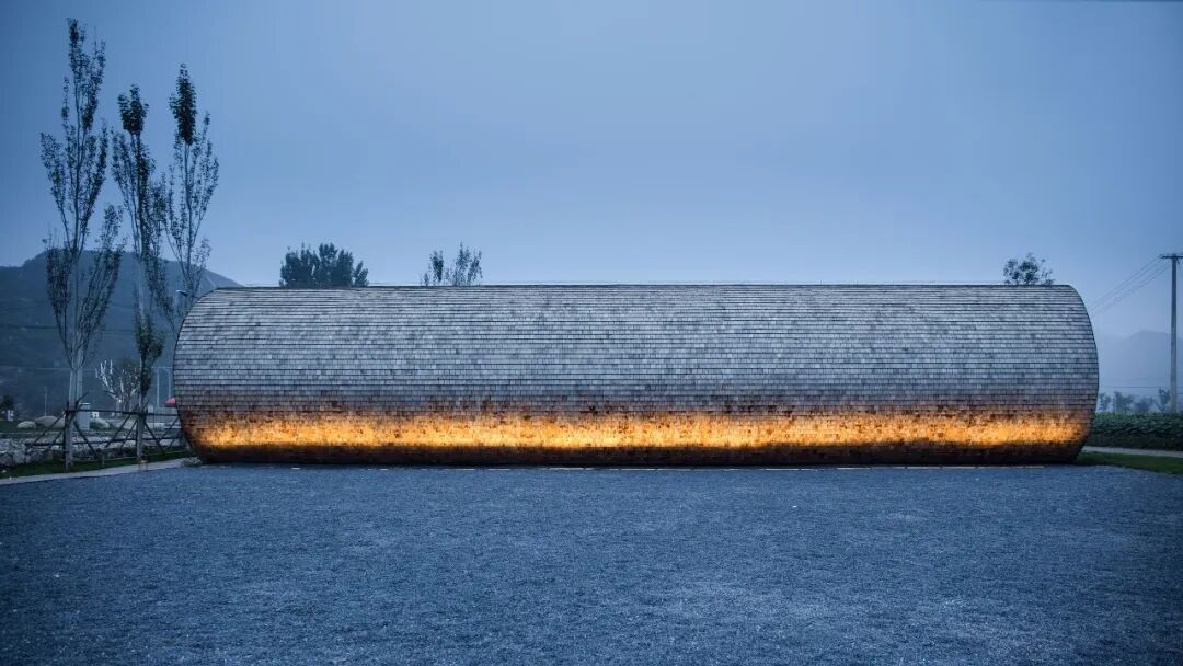 建筑师以建筑的造型作为隐喻的载体:在田园之上掀起一块草皮,如地毯般卷曲形成建筑,被掀起处暴露出绿植之下的土壤,揭示出「身处田园」的本质。「卷」暴露于外部的一侧以木瓦为主要材料,配合倾斜的屋面,避免风雨的侵蚀;屋顶内侧则覆以木材,并延续至卷曲墙面的内侧及地面,在材料的贴近性中将新形态关联至「旧记忆」,让建筑整体融入村落的自然、朴拙,如从「土壤」中自然生成。