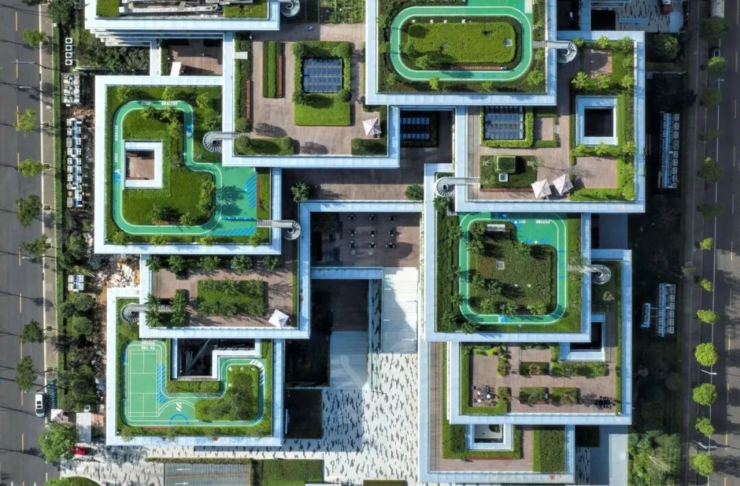 The outdoor pedestrian system on the roof is connected by a spiral steel ladder between each unit’s platform and garden path, providing an alternative to indoor traffic. The roof is equipped with planting sites for fruits and vegetables, 1,000 square meters of solar panels, as well as sky basketball courts, badminton courts, and mini runways. And even a three-dimensional miniature marathon loop from the ground to the roof is designed as an interesting project for outdoor sports. People walk through the platform landscape, blurring the boundaries between work and life, and creating a unique atmosphere for creative design companies.