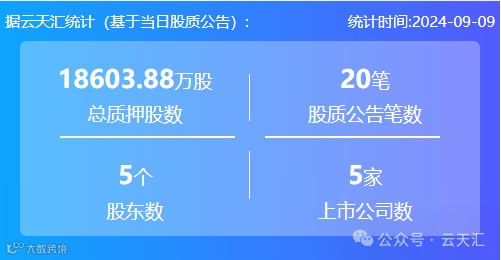 2024年9月9日,股票质押总质押股数1.86亿股,上市公司数5家,股质公告笔数20笔,股东数5个。