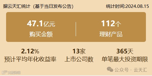 2024年8月15日,上市公司购买理财金额47.1亿元,共13家上市公司,理财产品112个。