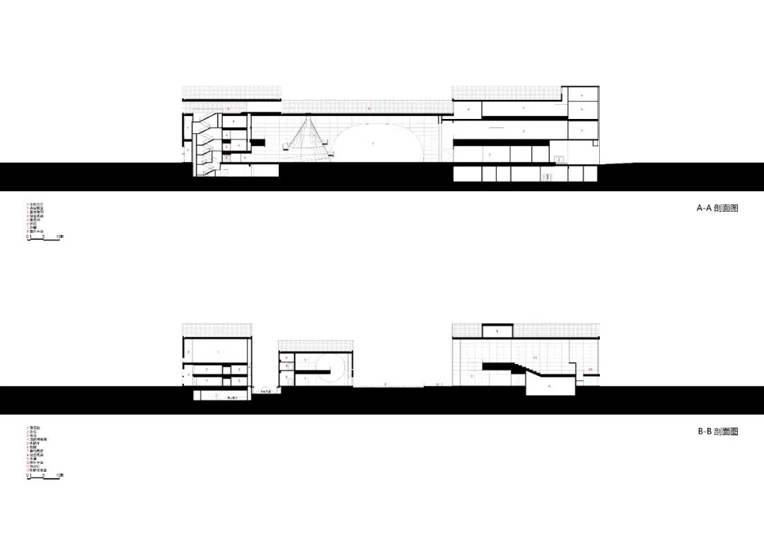 结构的对偶运用,在平面组织上采用横向与纵向交织的拱形剪力墙形成有效的双向抗震结构体系,在剖面组织上上部屋面采用预应力混凝土悬垂板+端部混凝土“唐瓦当”与下部基座的拱形剪力墙共同组成闭合的剪力墙传力体系。平面对偶的结构特征通过大模板的清水混凝土浇筑形成清晰的室内空间架构,而剖面对偶的结构关系则通过陶瓷和青砖的材料组合赋予特定的历史记忆和文化内涵。