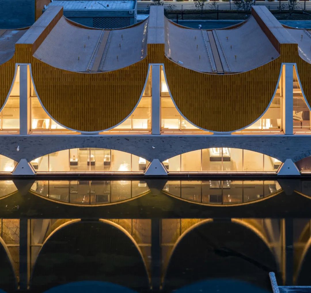 隋唐时代是我国古代技术发展的一个高峰期,跨越洛河而规模宏大的洛阳都城规划,明堂、天堂、龙门石窟等体量巨大的土木工程以及大运河的开凿都集中出现在这一时期。所以,我们抓住隋唐大运河这一古代水利工程的技术特征,以洛河上架设的拱桥结构为原型,用现代建造技术的自然呈现来取代对传统风格的具象模仿,从而实现古今文明的对话。
