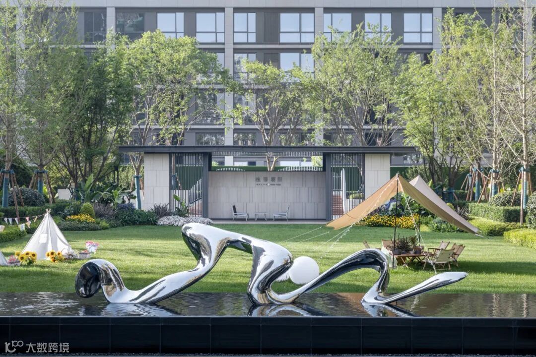 大门形态取自蜿蜒曲折的府河水系,以模拟府河绕城穿梭的的形态,体现项目对锦江文化的致敬。