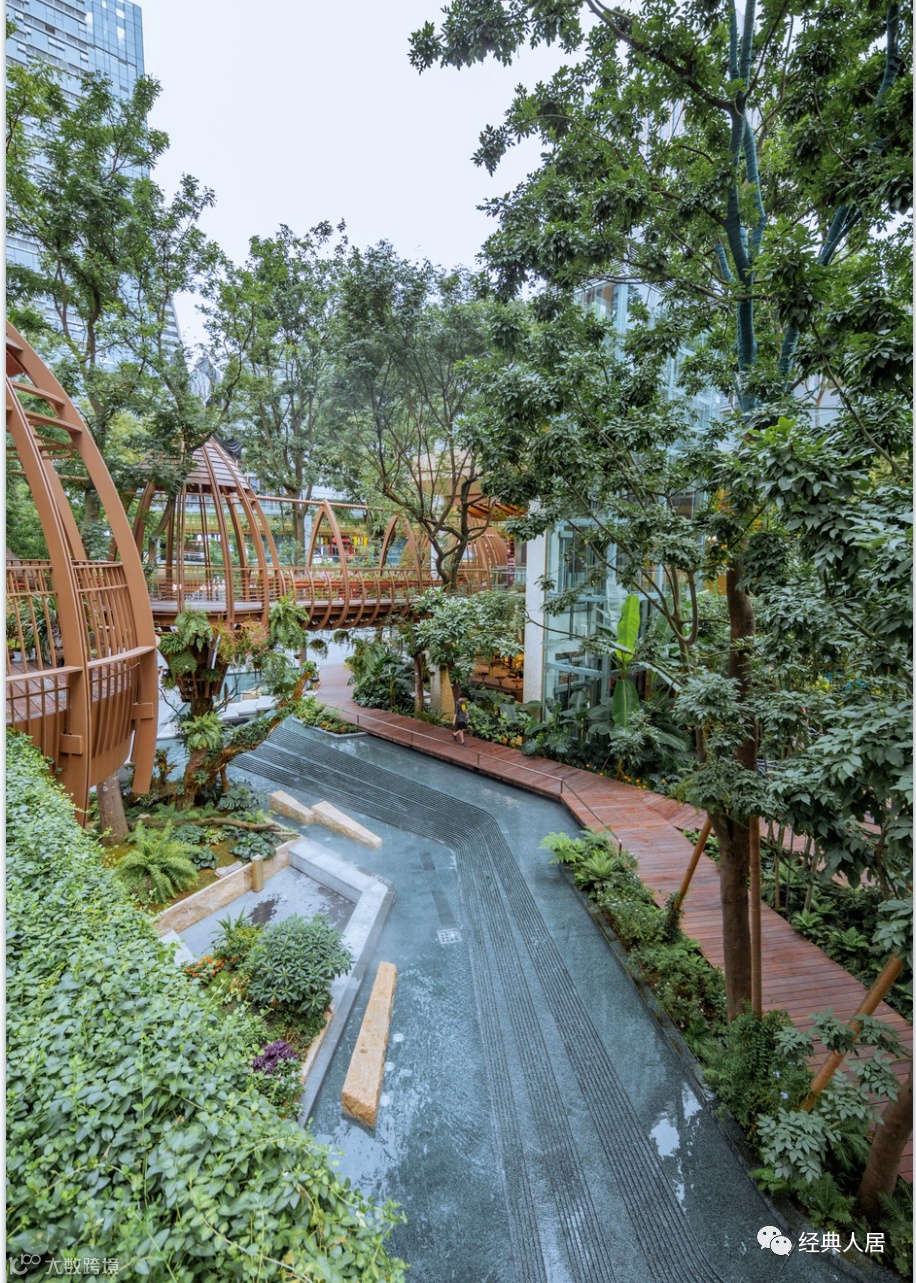 风雨连廊无缝连接酒店式入户门廊,串联高层楼栋大堂。在遮风避雨的功能之外,更注重观景体验的表达,和视线端景的营造,与园林造景结合,不沾风雨,感受四季,在自然中漫步归家。