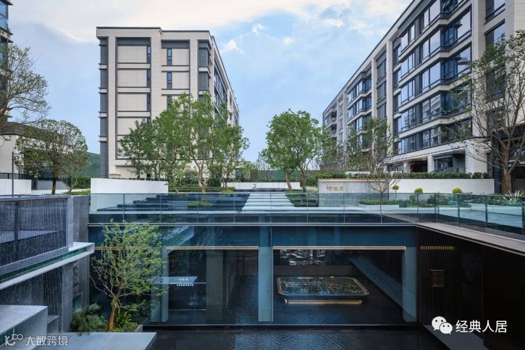 仪式感是高端住宅不可或缺的表达,酒店式归家入口配合风雨连廊是一线城市豪宅标配。但能像浣云居一样把功能和气派兼顾的很少。社区的主大门,结合台地高差条件,建造了横跨近70m的巨幅门廊入户,不弱于五星级酒店的气势。相较于普通豪宅大气磅礴的入户门廊,浣云居增设了车行落客环岛和迎宾大堂,业主通过电梯或扶梯进入地面园区,更兼具实用性,归家体验的仪式感对标高端度假级酒店。