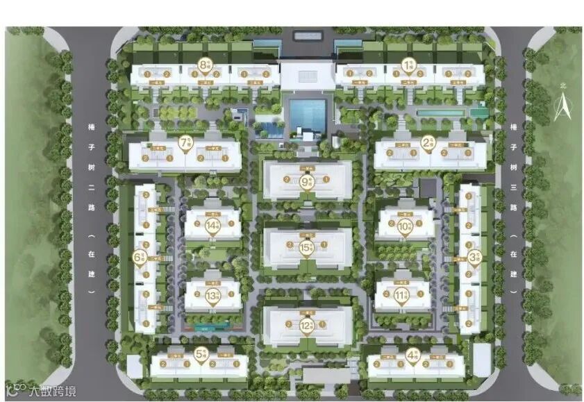 锦江金茂府占地约56.4亩,容积率1.5,规划了15栋6层板式洋房,项目采用阵列围合式布局。