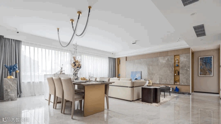 客餐厅空间落位奢尺宽厅打造。空间共享并视线通畅,非常的宽敞舒适,清新爽朗,大尺度更宽敞。