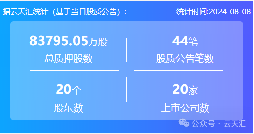 2024年8月8日,股票质押总质押股数8.40亿股,上市公司数20家,股质公告笔数44笔,股东数20个。