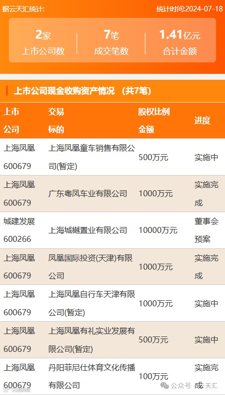 2024年7月18日,资产交易成交金额1.41亿元,上市公司2家,成交7笔,上市公司现金收购资产7笔。