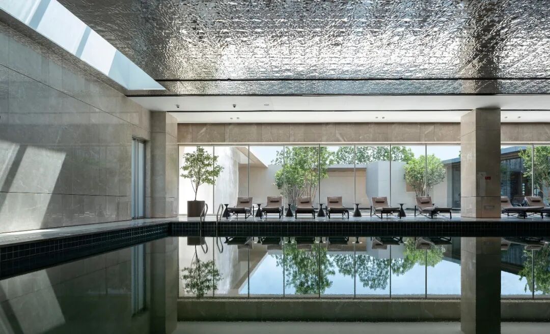 白天,玻璃体量的颜色融入天空,反射着周边建筑剪影。树影婆娑,落在沉着的石墙上,纯粹而安定。夜晚到来,灯槽逐渐亮起,像跳动在水面上的音符。健身房和泳池化身舞台,二层影影绰绰,一层光亮四射,向城市和内院展示健康生活。