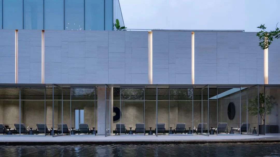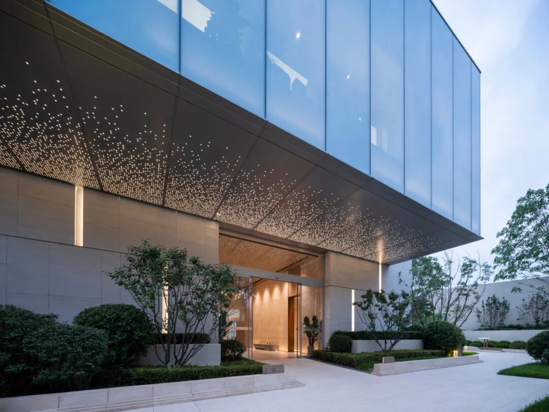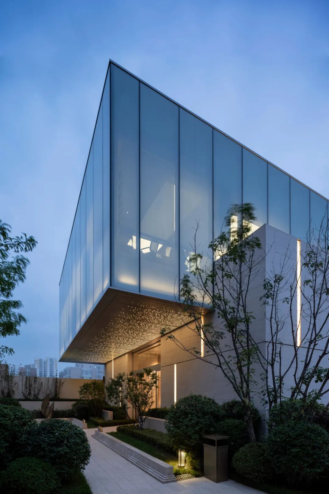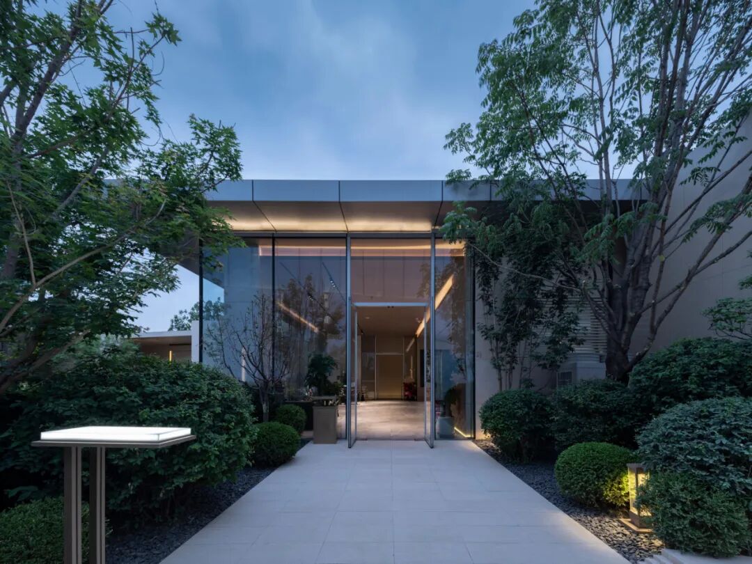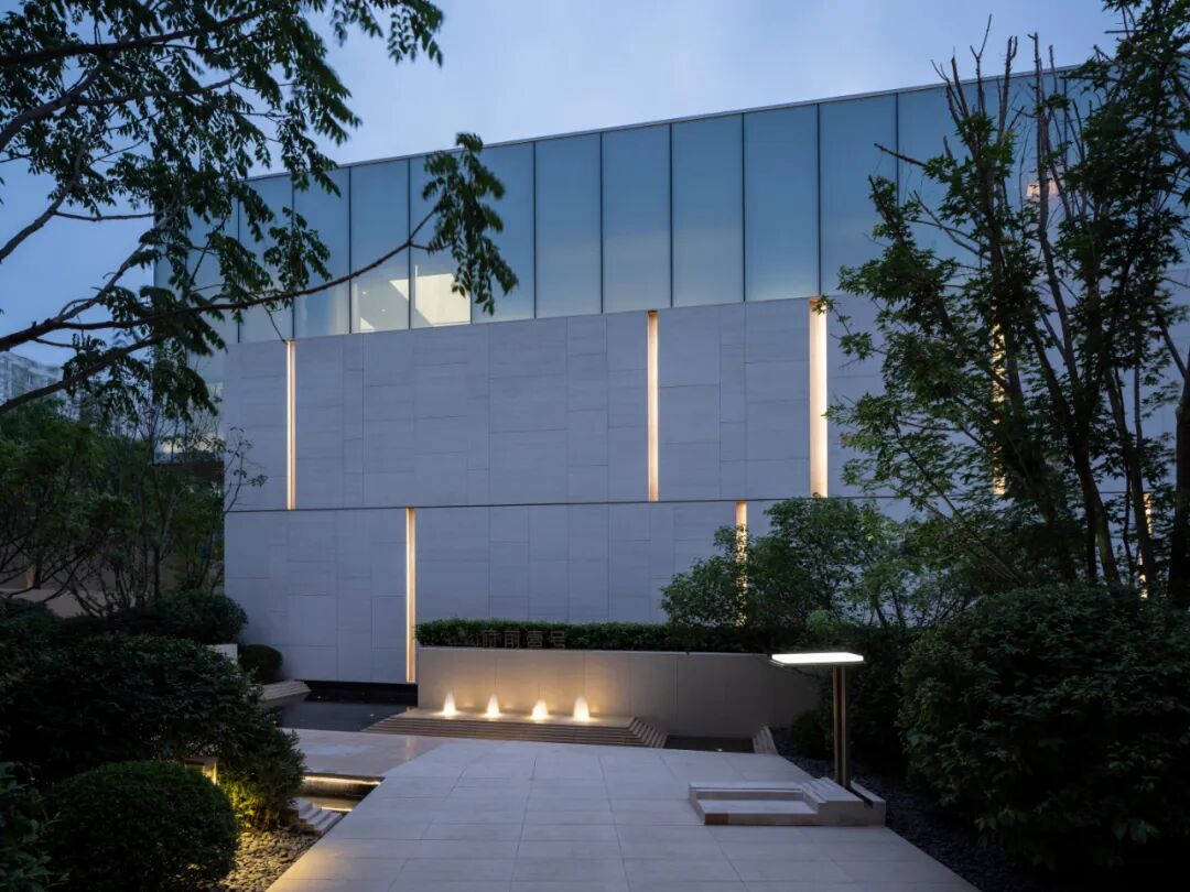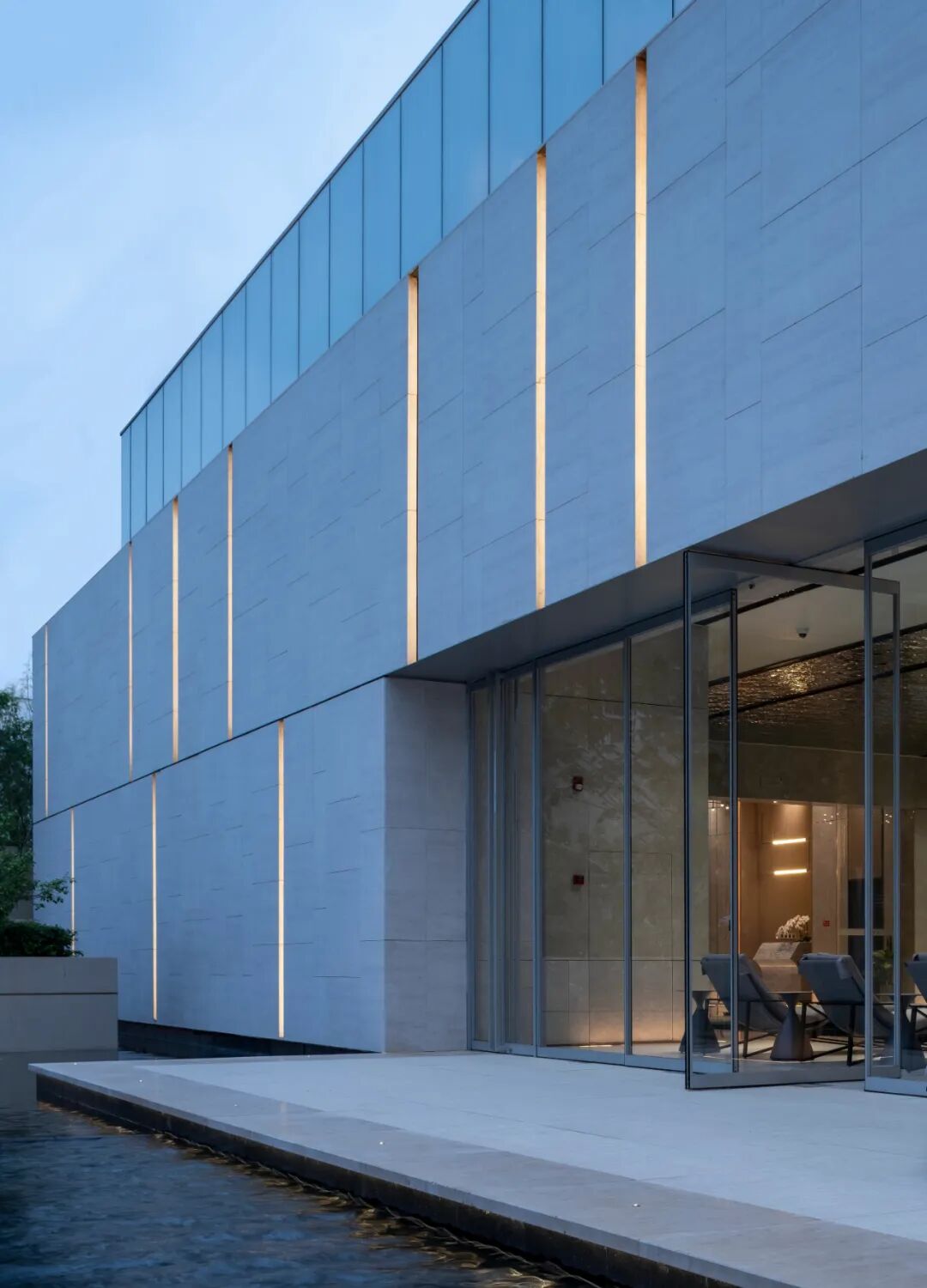 建成呈现出来的,是一座有中心水景的宅园——建筑与景观交融,空间开合随动线的节奏和视线转折而变化。景观元素,有水池、飞瀑,有廊墙、景轩,以及树和艺术品。通透的入口大堂,是园林中“亭”的意象。山的意境,则用会所表达。会所建筑和廊墙,化身为庭园中的“山”和“石”。山石连接交错,成为一体。飞瀑从半山落下,水池底,是几何雕刻处理的石材铺面——整座庭园,仿佛是从石头中刻出的雕塑空间。
