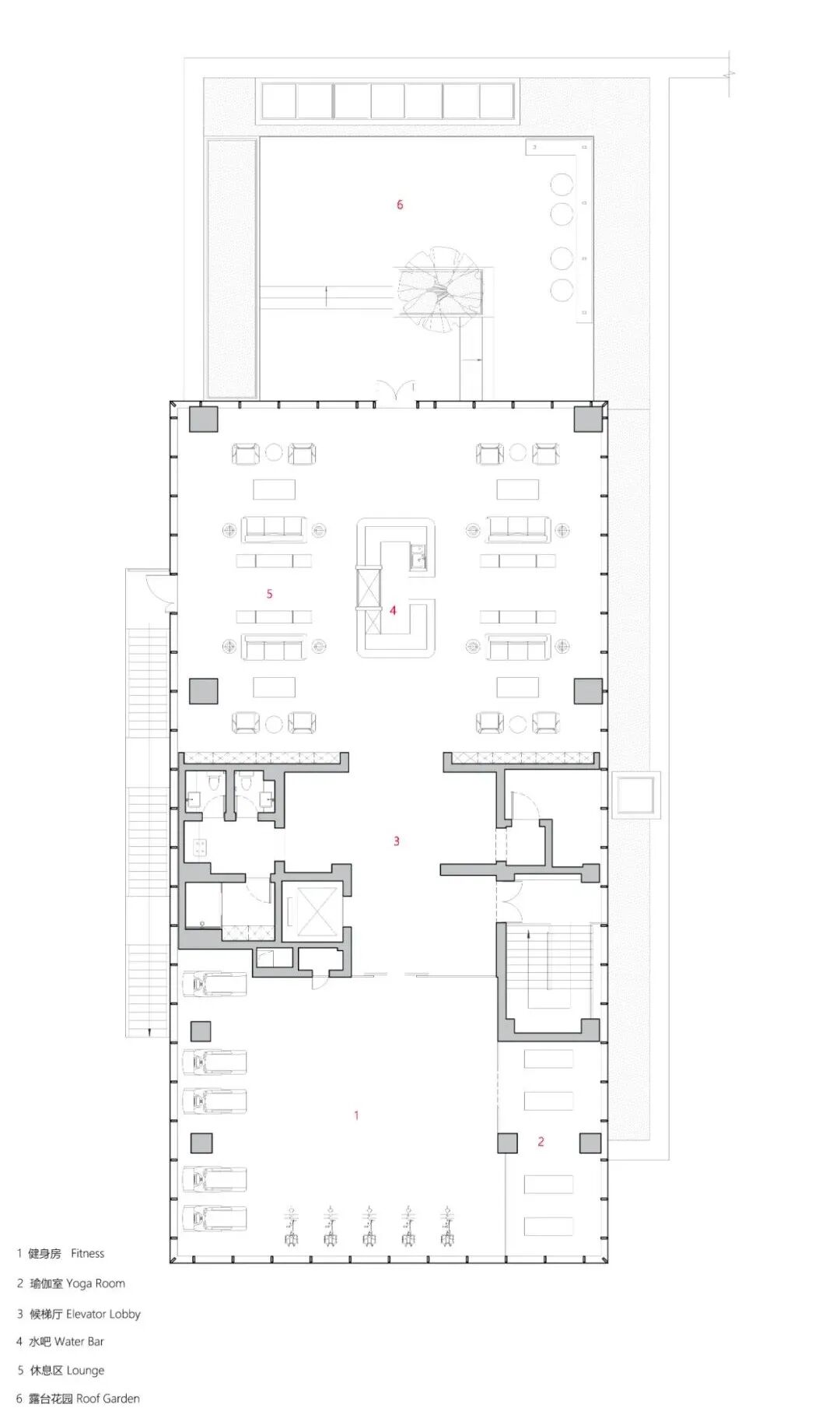 二层健身,光线经半透明的外皮过滤进入,室内如薄纱笼罩,氛围让健身者心绪平静,同时感到被保护。在二层屋顶花园,可以俯瞰小院,享受微风。