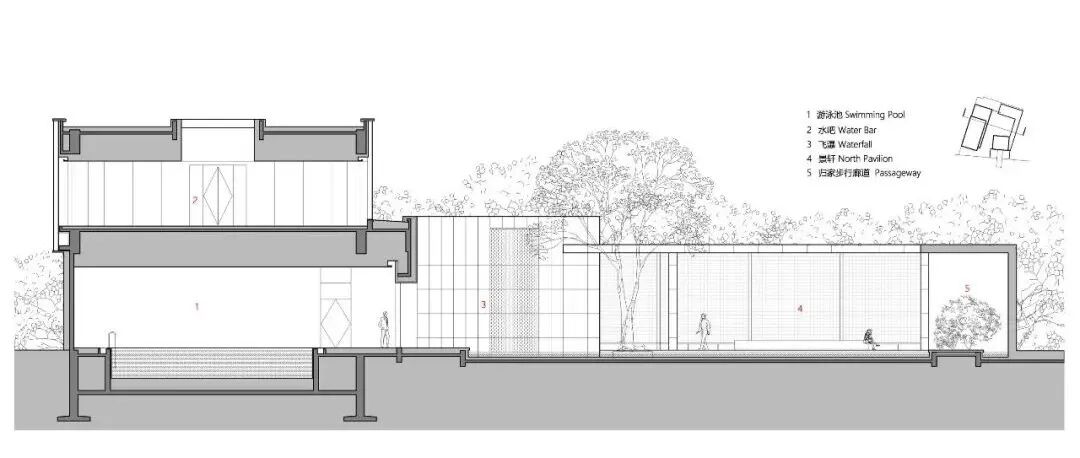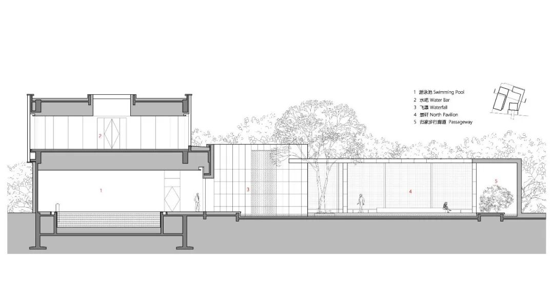 ▼东西向剖面,可见北侧的景轩和飞瀑 East-west section, where the North pavillion and waterfall are visible