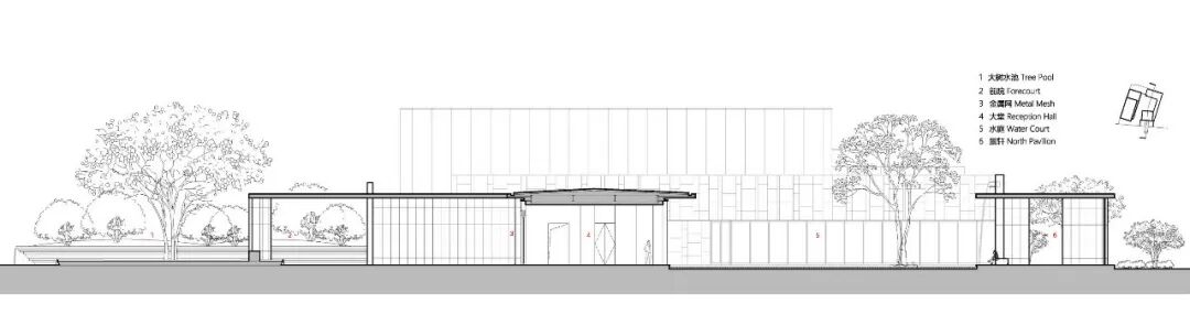 小院南侧是城市道路,一颗大树标志了园区入口。大树水池周边是落车空间,入口廊道尽端是大堂,经过长雨棚,穿过水池前厅空间,就会看到金属幕帘后的大堂。