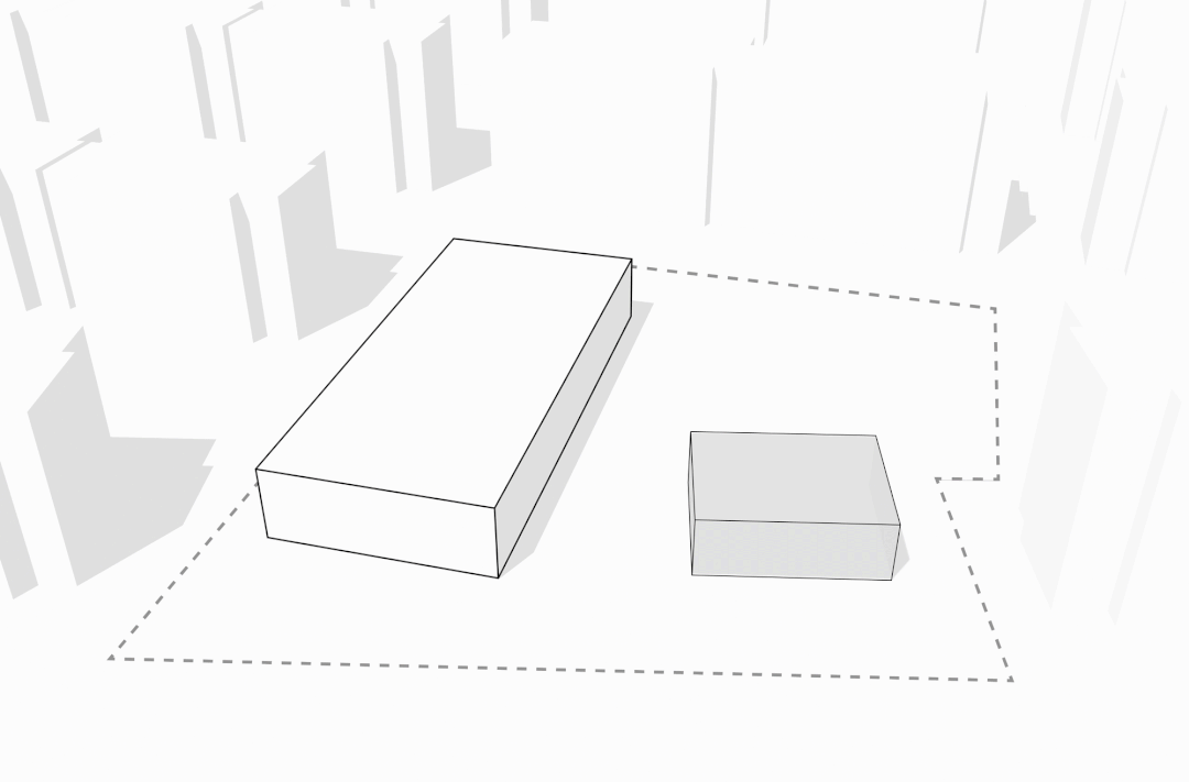 用地是一个住区前面的小院,地界大约50米见方。任务书要求,设计一个业主归家空间,包括健身会所和泛大堂:对街道相对封闭,内部小而精致,有深宅大院,大隐于世的意境。