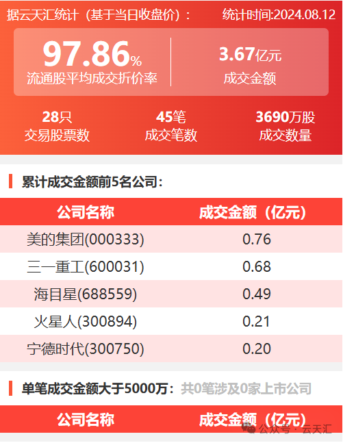 2024年8月12日,大宗交易成交金额3.67亿元,交易股票数28只,成交笔数45笔,流通股平均成交折价率97.86%,成交数量0.76亿股。