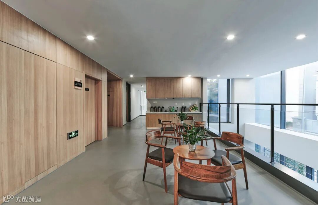 设计师认为建筑不该只是相互隔阂、缺乏生气的格子间,可以有更多怡然自得的交流与沟通。所以在室内空间引入中式园林“围”与“透”的景深关系,以游园概念贯穿建筑内部结构布局,改变以往缺乏接待、沟通相关的公共空间。