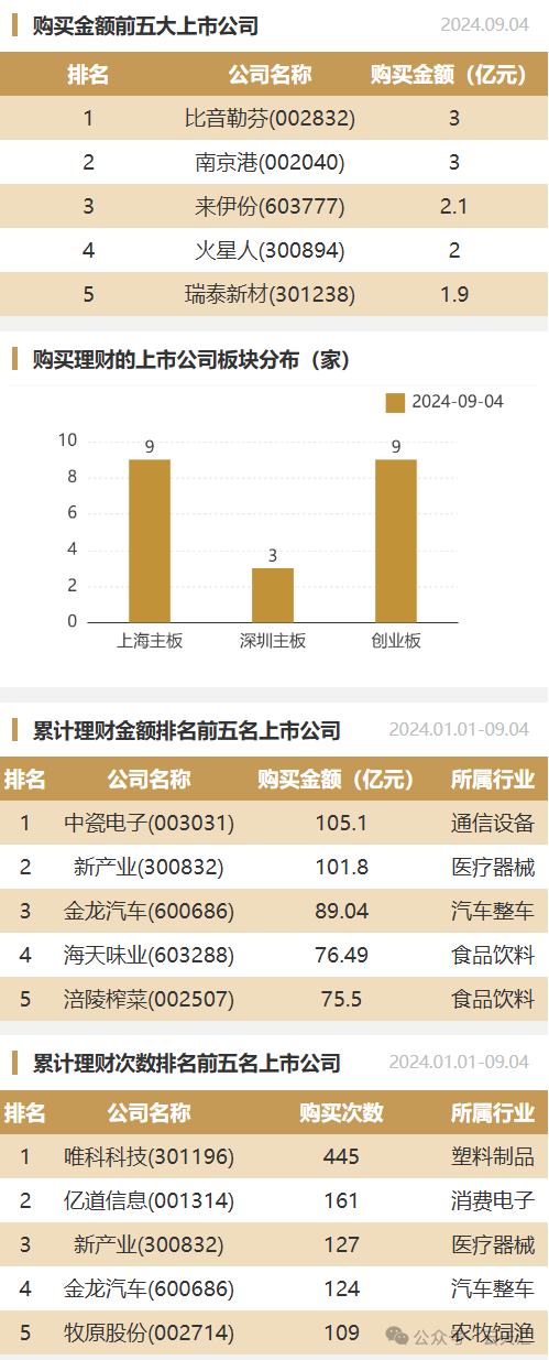 2024年9月4日,上市公司购买理财金额22.45亿元,共21家上市公司,理财产品35个。