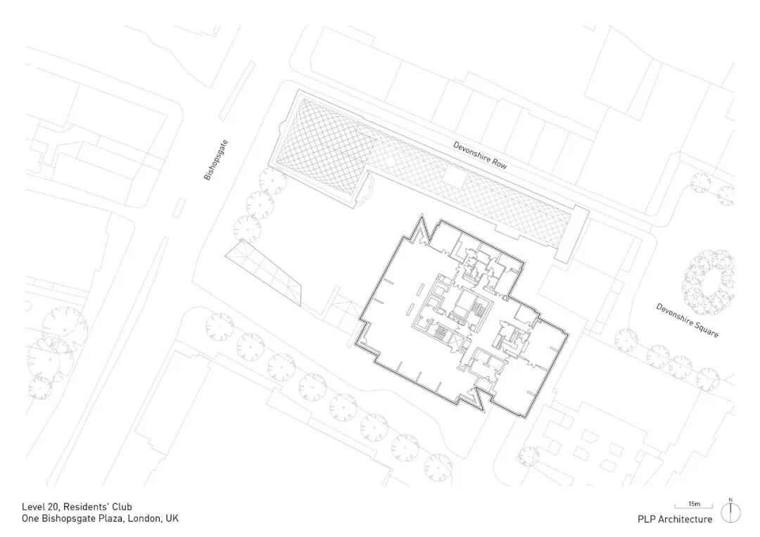 One Bishopsgate Plaza 是近年来在该市建造的第一个高层住宅和酒店开发项目,是对该地区持续活力的大胆承诺。该场地包括一座新的 43 层高的塔楼,用于容纳酒店和住宅用途,以及位于德文郡街 (Devonshire Row) 的一栋翻新和扩建的维多利亚式建筑,其中包括餐厅、办公室和零售空间。零售单元直接通向街道和新的公共空间。