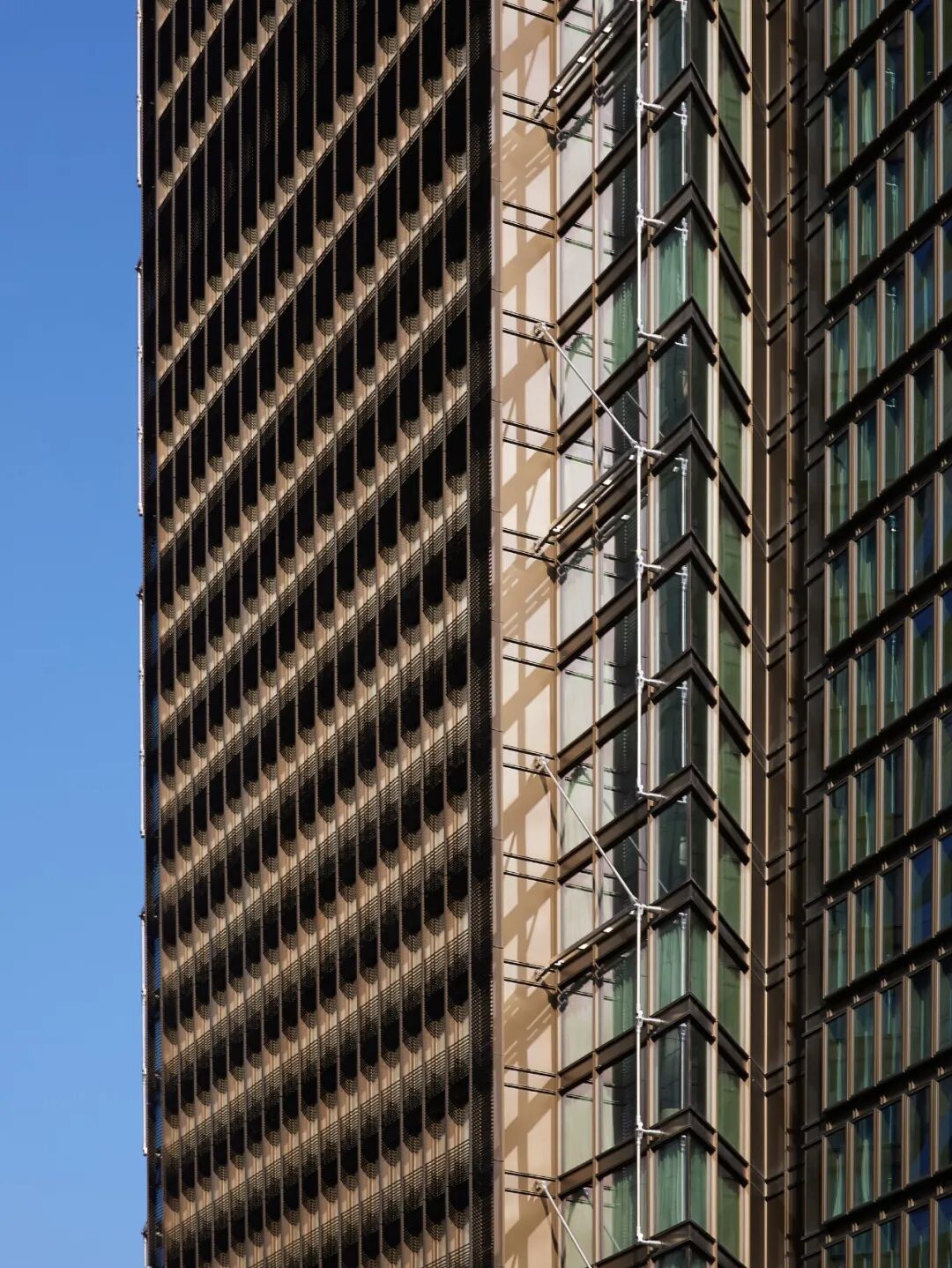 塔楼的设计反映了整体开发的质量和雄心,大面积的玻璃结合了不同配置的青铜百叶窗,为整体形式提供了审美差异和建筑的复杂性。这座建筑随着它的上升而后退,容纳了露台和其他舒适空间,并与附近更坚固、更块状的塔楼形成了视觉对比。