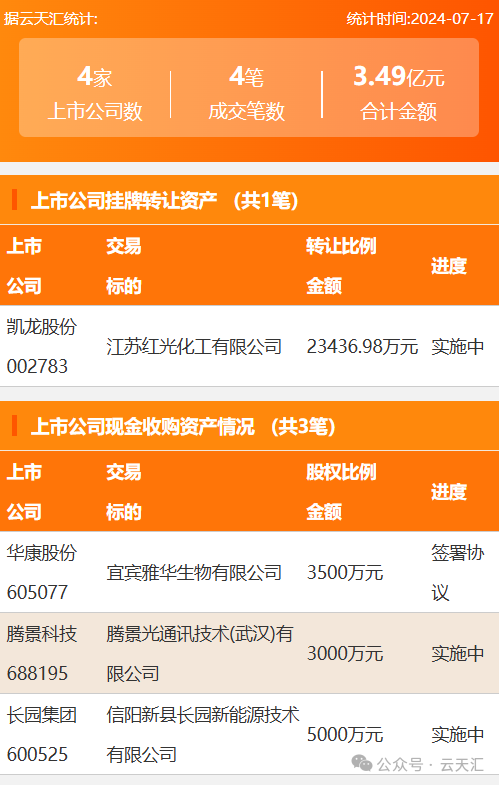 2024年7月17日,资产交易成交金额3.49亿元,上市公司4家,成交4笔,上市公司挂牌转让资产1笔,现金收购资产3笔。