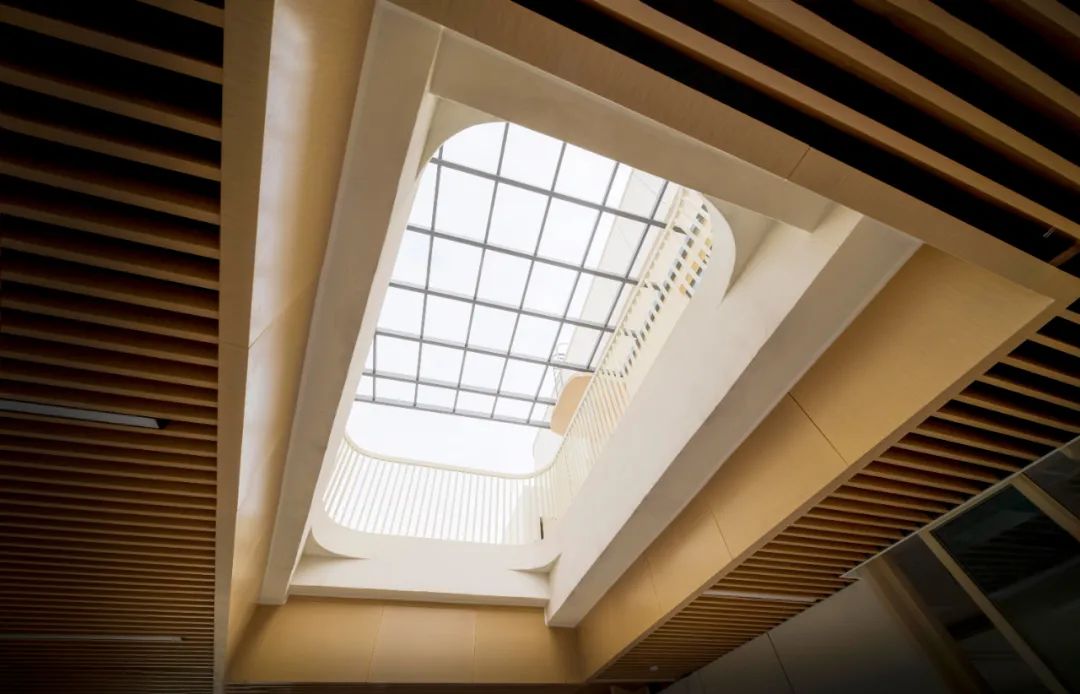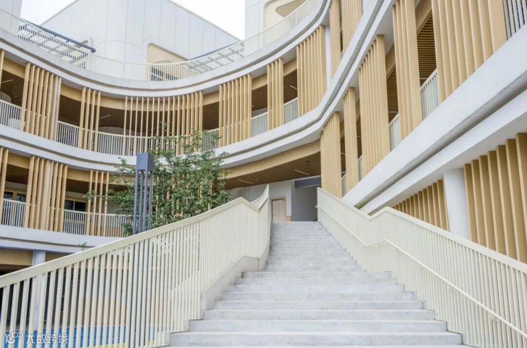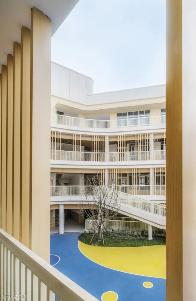 仰望天空,幼儿园内部楼梯上下贯通,随着高度提升,视线不断开敞,直至到达屋顶平台,视线完全敞开,并通过设置类似天井的空间,增加空间体验趣味。