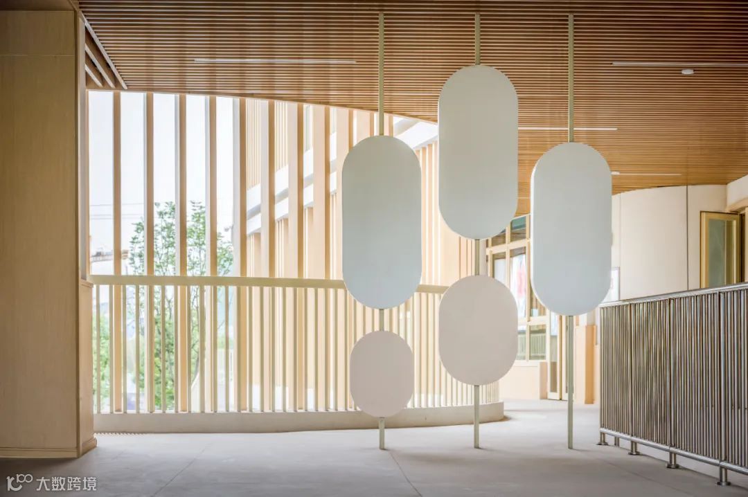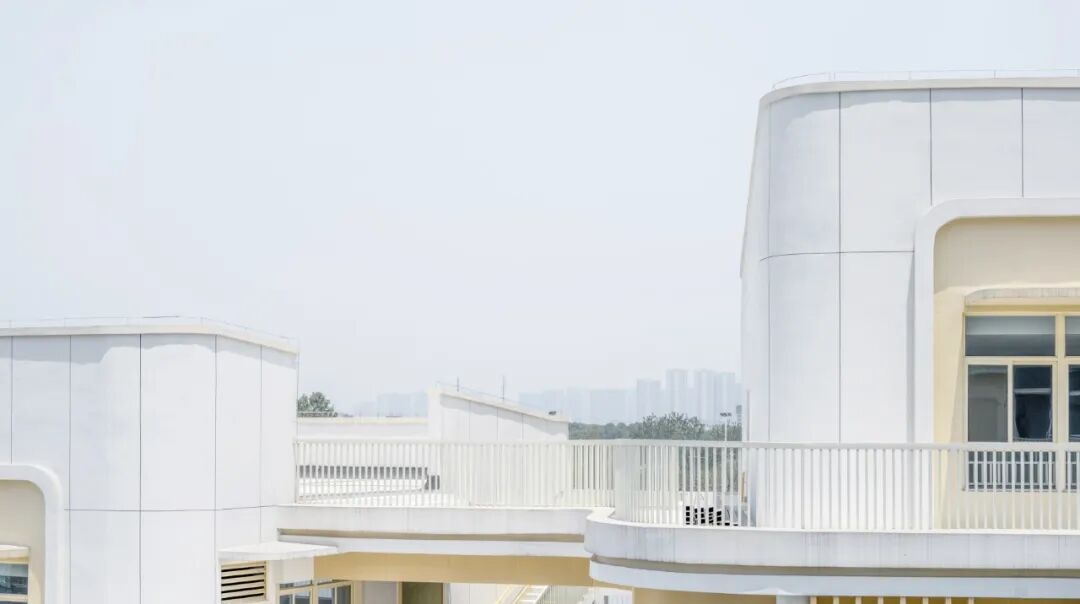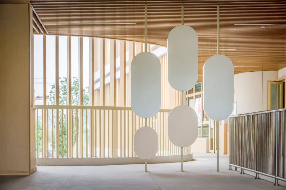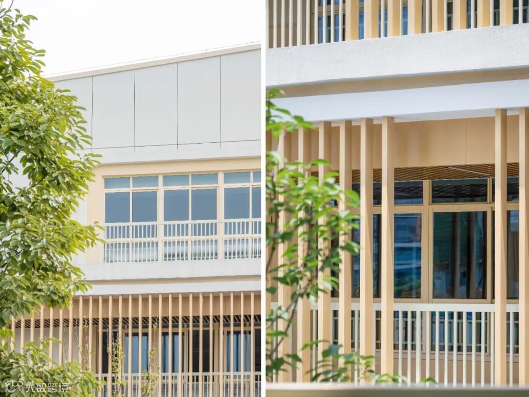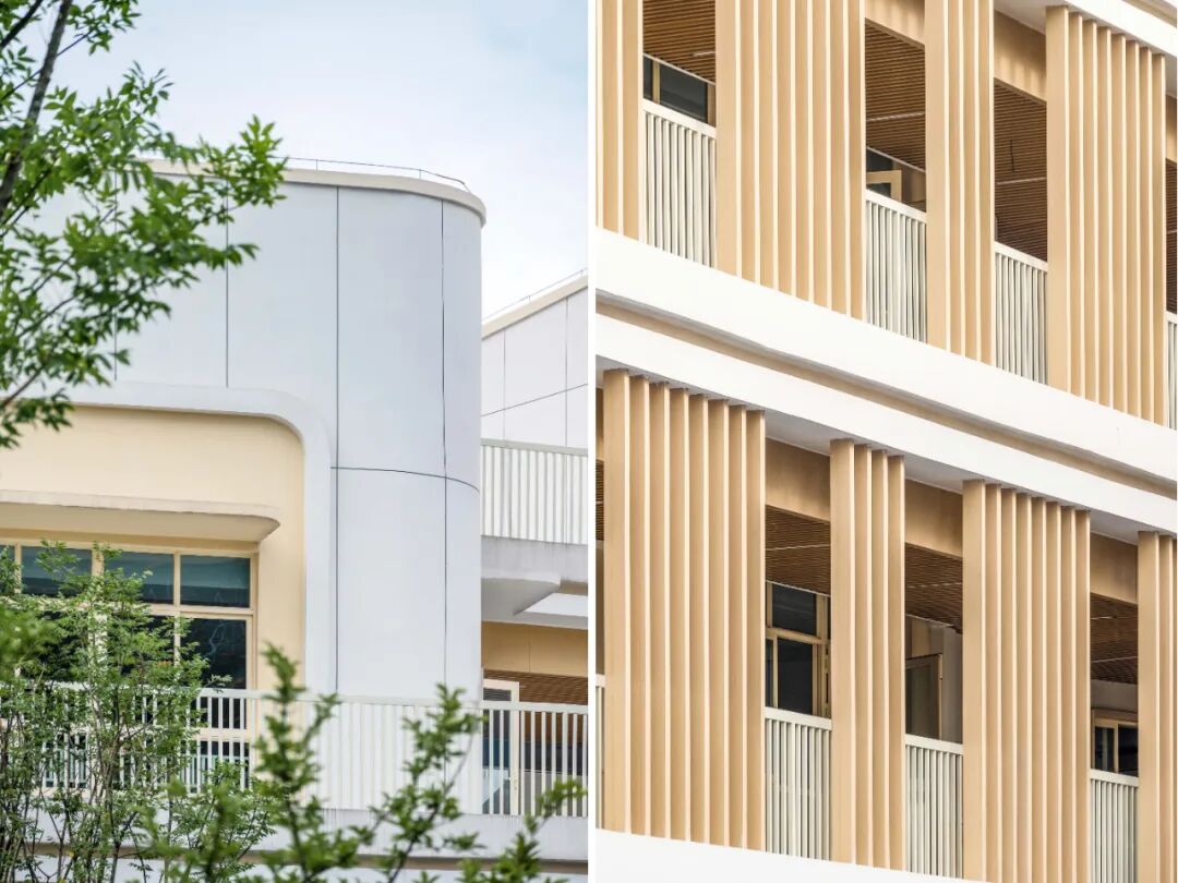 建筑以大面积的白色真石漆和仿木纹的格栅营造简约自然又不失活泼的氛围,遮挡太阳的直射的同时,也形成了绝妙的光影视觉效果,让孩子们仿佛在林间穿梭,在大自然中游憩,在绿色、健康的环境呵护下茁壮成长。