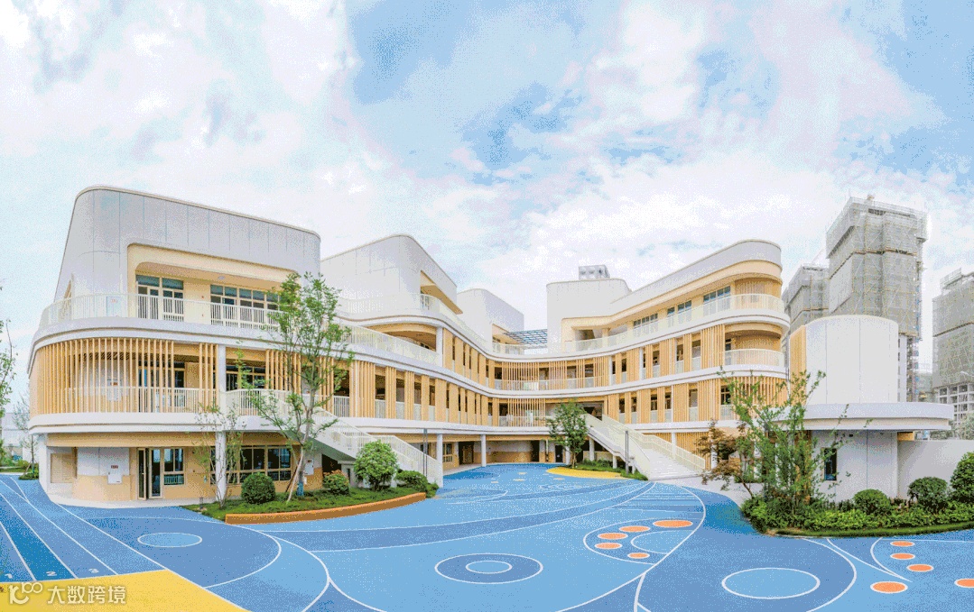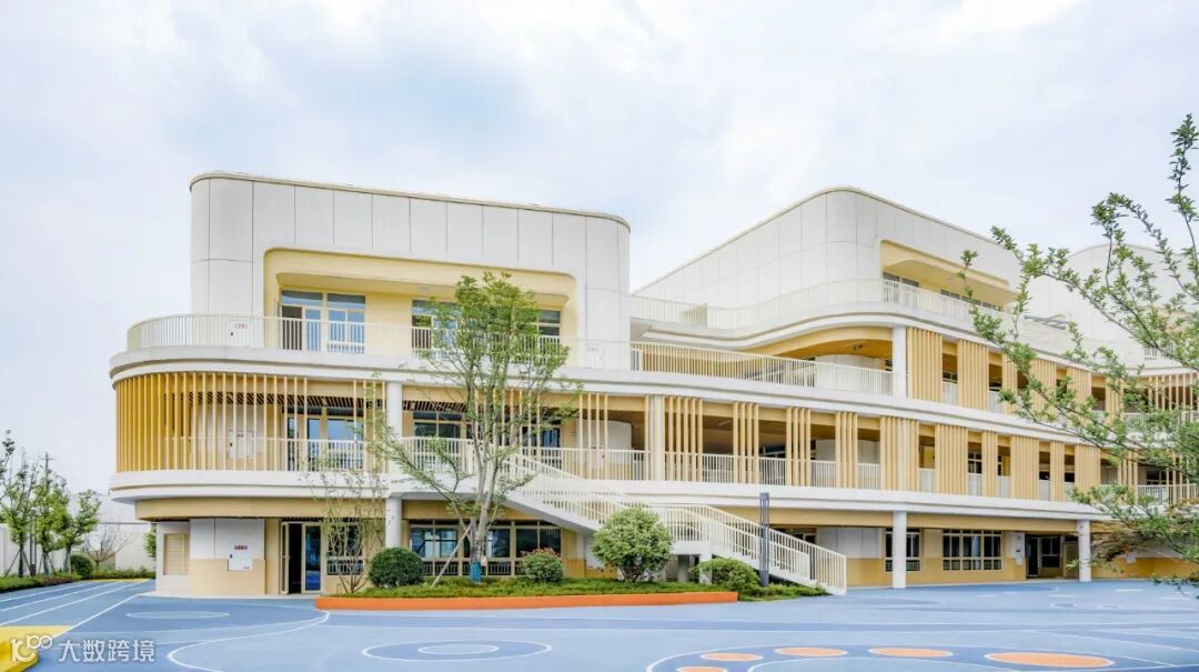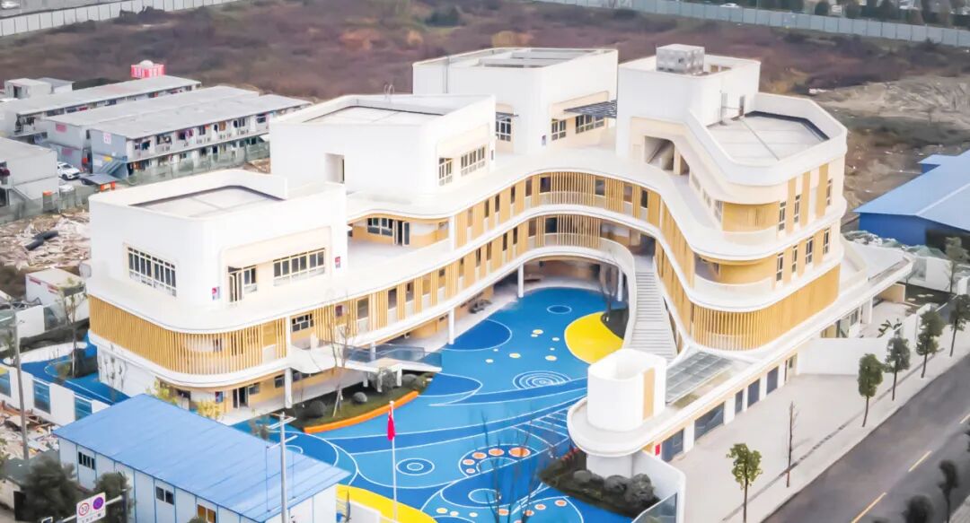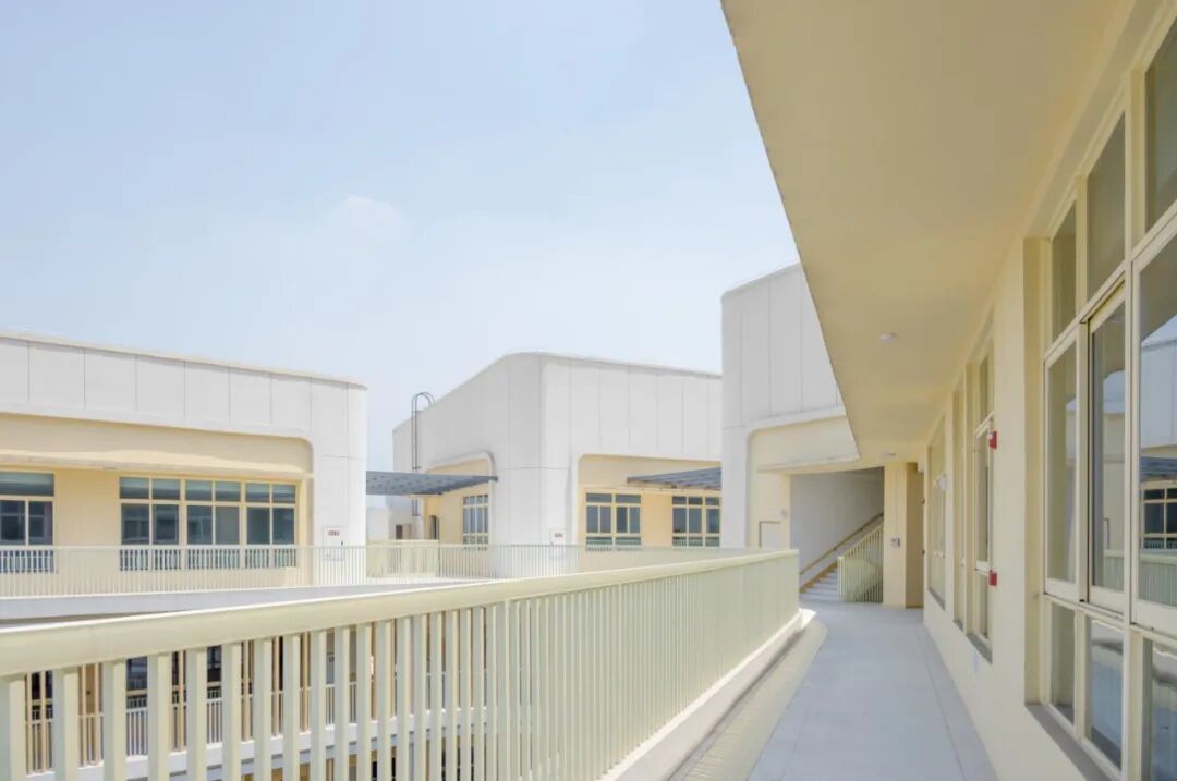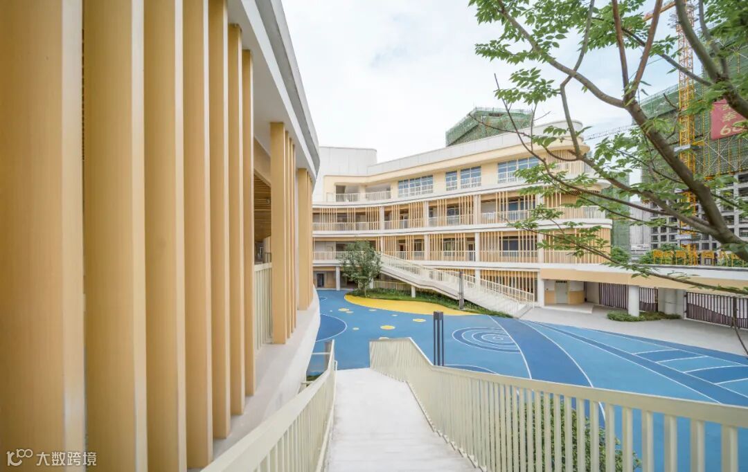 建筑以大面积的白色真石漆和仿木纹的格栅营造简约自然又不失活泼的氛围,遮挡太阳的直射的同时,也形成了绝妙的光影视觉效果,让孩子们仿佛在林间穿梭,在大自然中游憩,在绿色、健康的环境呵护下茁壮成长。