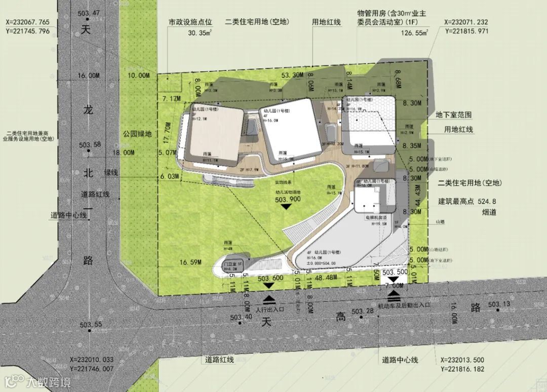 城市快速发展,土地资源日渐紧张,幼儿园用地普遍存在容积率及覆盖率偏高的特点,而幼儿园建筑对层数、日照有严格控制;教育理念日益革新,要求建筑本身具有创新性,同时需要与城市空间和谐共融。因而,无论是外部环境,亦或是内部需求都为项目带来了新的挑战。