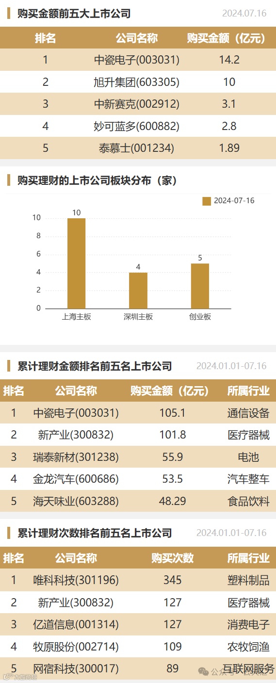 2024年07月16日,上市公司购买理财金额41.48亿元,共19家上市公司,理财产品52个。