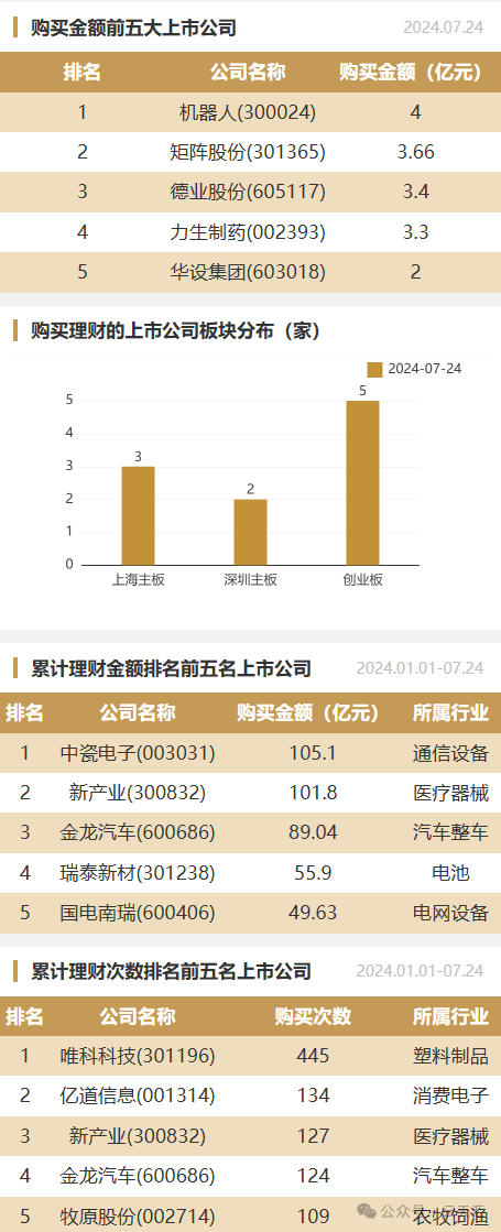 2024年07月24日,上市公司购买理财金额20.36亿元,共10家上市公司,理财产品43个。
