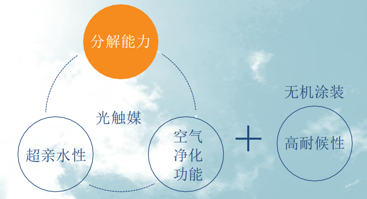 通过阳光(紫外线)分解污垢,达到自洁功效,可以分解外墙表面的油脂类污垢、灰尘、带色液体、霉菌、青苔等污垢,大幅度减弱这些污垢对外墙的沾附力。