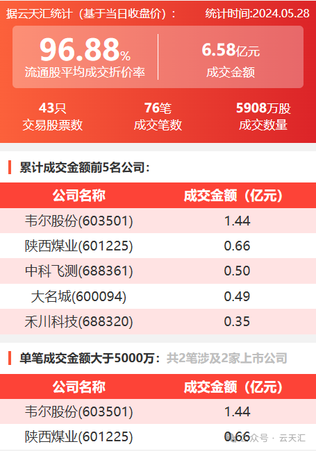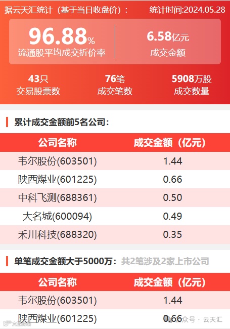 2024年5月28日,大宗交易成交金额6.58亿元,交易股票数43只,成交笔数76笔,流通股平均成交折价率96.88%,成交数量0.59亿股。