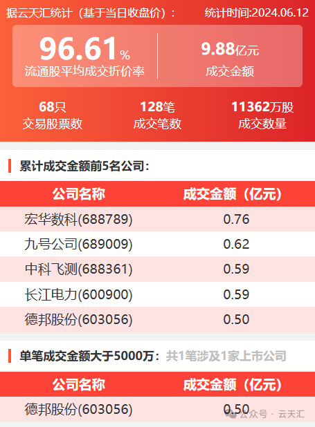 2024年6月12日,大宗交易成交金额9.88亿元,交易股票数68只,成交笔数128笔,流通股平均成交折价率96.61%,成交数量1.14亿股。
