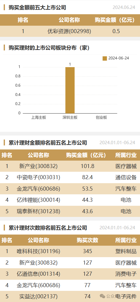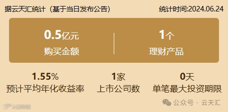 2024年06月24日,上市公司购买理财金额0.5亿元,共1家上市公司,理财产品1个。