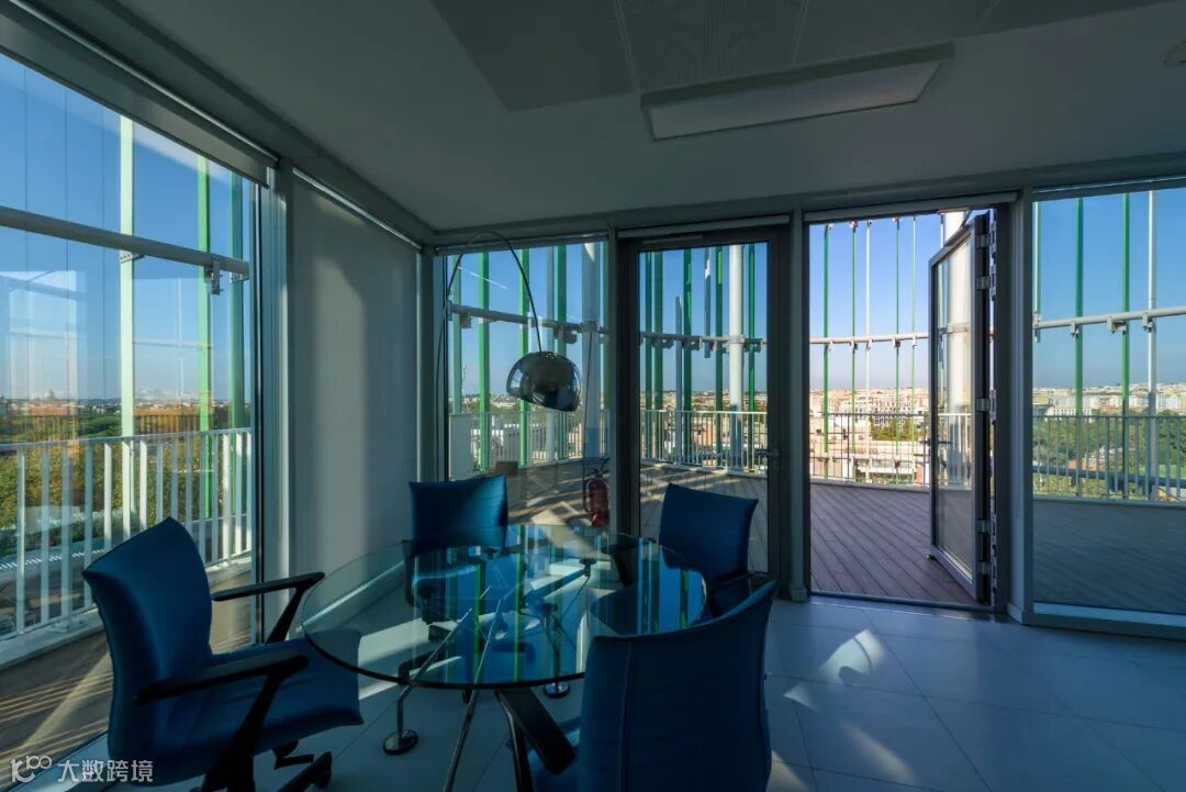 建筑三层以上的空间私密性较高,承载大学的几个重要功能:DAMS机构、 办公空间和教学空间。布局概念将办公室和会议室安排在外围,保证白天和晚上房间的自然通风。全玻璃幕墙的设置可以实现高水平的自然日光,从而减少白天使用人造光的机率。建筑内部的主要空间都可以俯瞰三层平台的空中花园,可缓解视觉疲劳,具有极佳的视野。