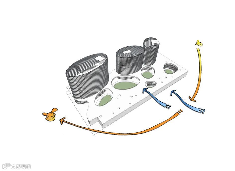 该项目以被动设计和环境可持续性为建筑方案基础,最大程度地减少能耗并优化室内外舒适度。通过研究当地气候和太阳高度,将建筑物的形状设计为椭圆形,东西两面逐渐变细,有助于减少阳光照射,从而防止夏季过热和眩光。