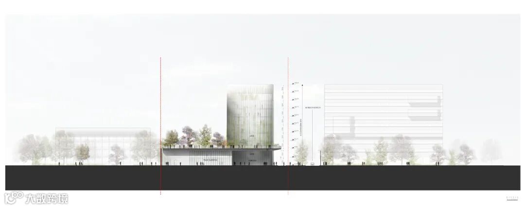 The space above the third floor of the building is highly private and carries several important functions of the university: DAMS, offices and teaching space. The layout concept arranges offices and meeting rooms on the periphery, guaranteeing natural ventilation of the rooms during the day and night. The all-glass façade allows for high levels of natural daylight, reducing the chance of artificial light being used during the day. The main space inside the building can overlook the sky garden on the three-story platform, which can relieve visual fatigue and have an excellent view.
