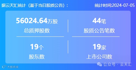 2024年7月5日,股票质押总质押股数5.60亿股,上市公司数19家,股质公告笔数44笔,股东数19个。