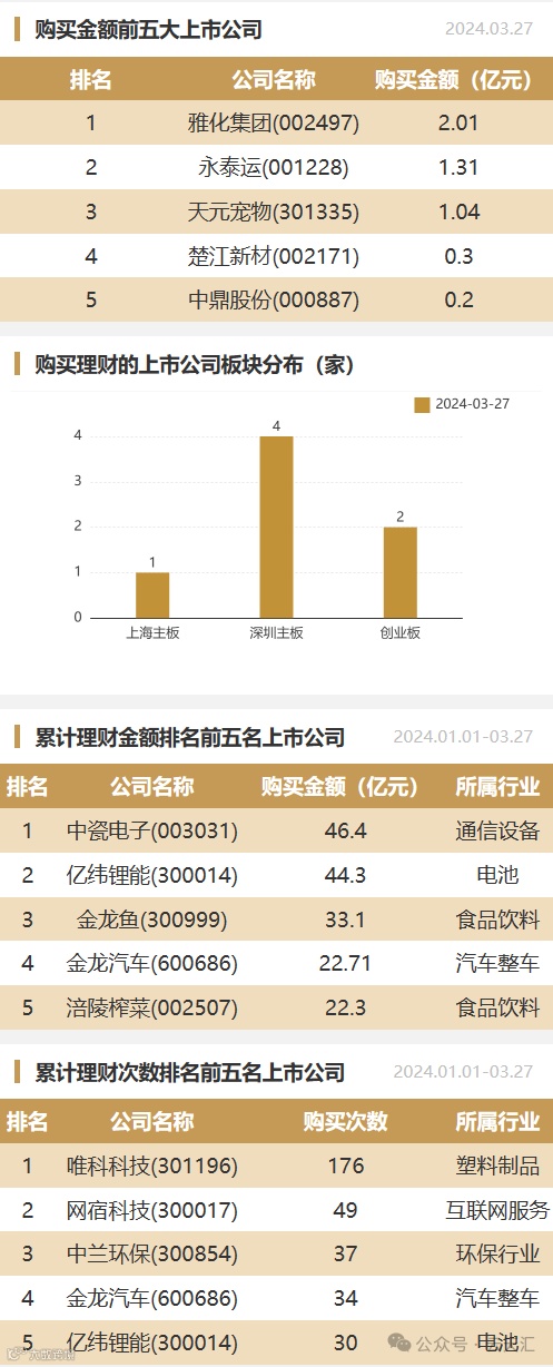 2024年03月27日,上市公司购买理财金额5.16亿元,共7家上市公司,理财产品13个,单笔最大投资期限204天。