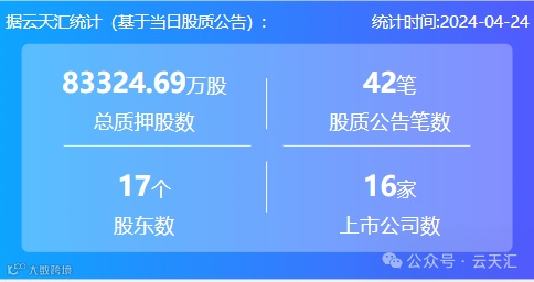 2024年4月24日,股票质押总质押股数8.33亿股,上市公司数16家,股质公告笔数42笔,股东数17个。