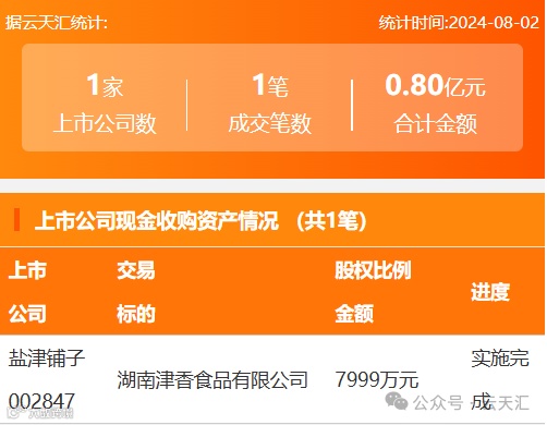 2024年8月2日,资产交易成交金额0.8亿元,上市公司1家,成交1笔,上市公司现金收购资产1笔。