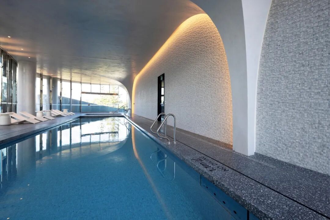 Private amenities of the ground floor include a resident lounge, boardroom, and function room. On the first floor, a 15-meter pool and spa sit beneath a vaulted ceiling and open to a garden terrace overlooking the coastal parklands. Other resident amenities include a gym, sauna, hammam steam room, and treatment rooms. The minimalist, tactile spaces are designed for the senses, creating a spatial sequence and atmosphere that will have a sensory and soothing effect on the user.
